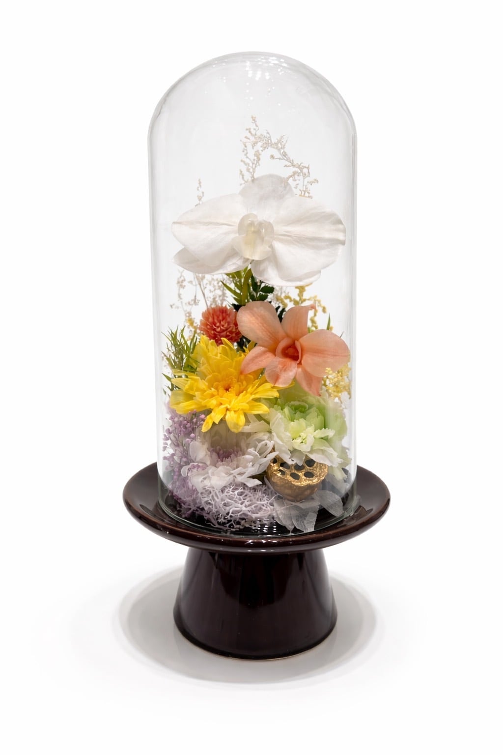 すべてプリザーブドフラワーを使用した洋風仏花です。容器素材は陶器&ガラスとなります。