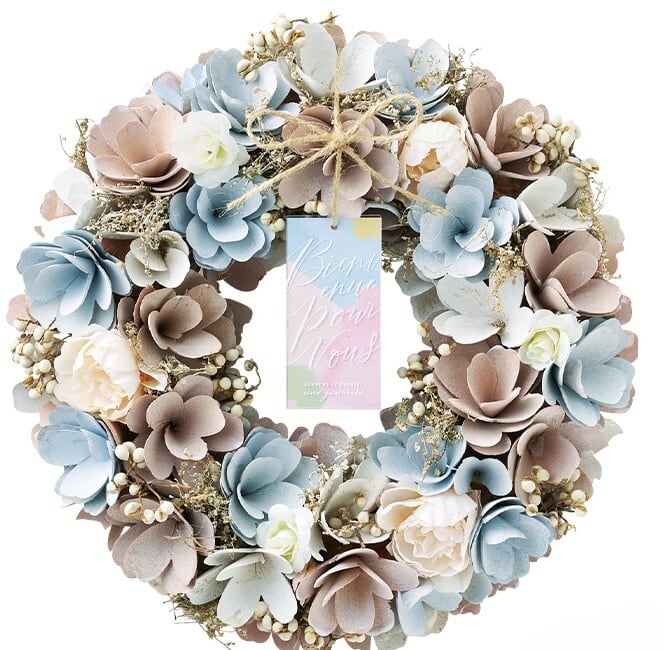 リースは丸く円を描くように作られており、『幸せがずっと続きますように』